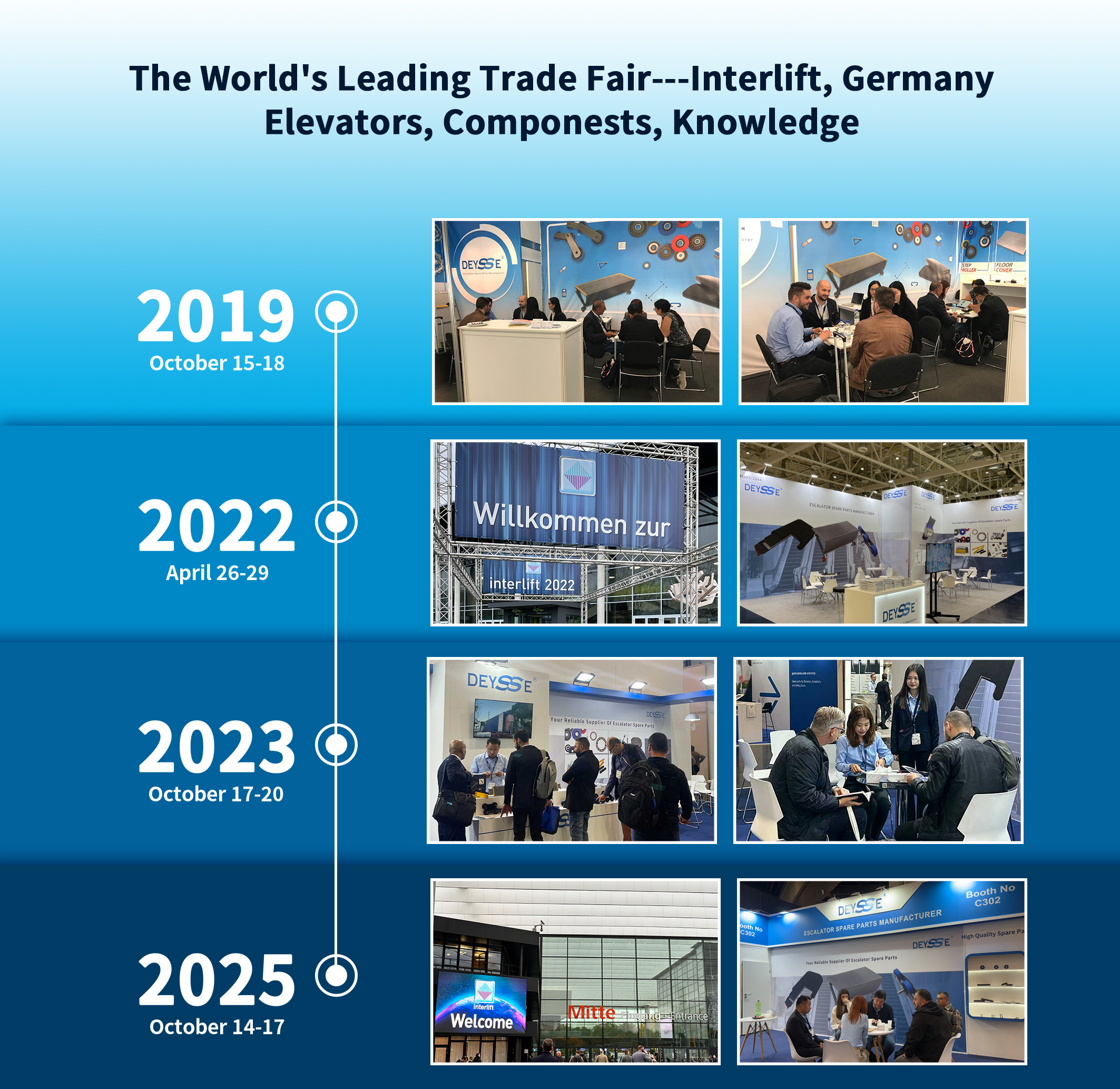 Deysse, a professional Chinese manufacturer of escalator parts, has been an active participant in Interlift over the years, as shown in the images from different editions. We are widely recognized by customers for our high - quality parts, rapid response, and professional services.